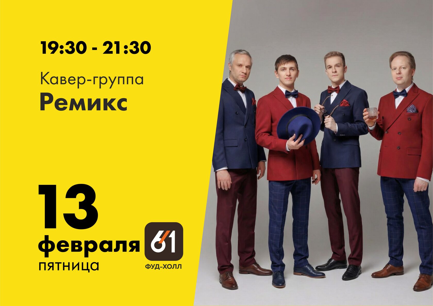 На территории Фуд-холла 6/1 в 19:30 выступит кавер-группа «Ремикс».